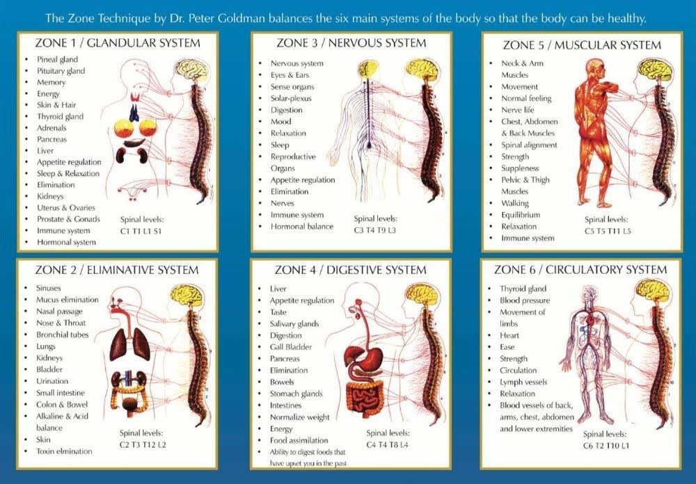 In the Zone Technique framework, the body is classified as an electrical machine with the 6 zones representing a positive pole in the body. The spinal cord is the negative pole. When there is a disturbance in any of these zones, that zone is shorted out.